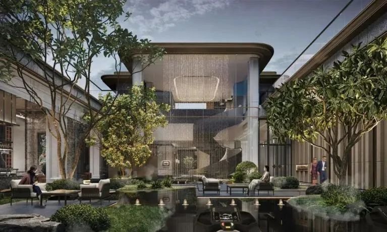 入口前方另有一个下沉庭院,最引人瞩宗旨莫过于近两层高的垂瀑,以及大面积的镜池设想,每个卡座都像一座浮岛,漂浮正在水面上,带来强烈的度假感。无论是室觉成效还是真际体验,都让人如同置身于一个高端度假胜地,尽享安好取舒服。那一切使得国毁颂不只是一座住宅,更是一件艺术品,完满融合了现代糊口取传统文化的魅力。
